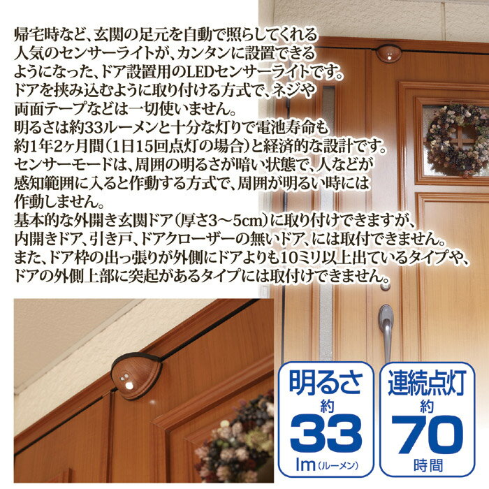 広告文責:株式会社M&Sジャパン夜間に人などを感知して約15秒間点灯 簡単設置の落ち着いた木目調のデザイン ●ドアに挟むだけカンタン取付けのセンサーライト ●ドアを利用するので、壁などへの面倒な取り付けが不要 ●帰宅時など、玄関の足元を自動で照らしてくれる人気のセンサーライトが、カンタンに設置できるようになった、ドア設置用のLEDセンサーライトです。