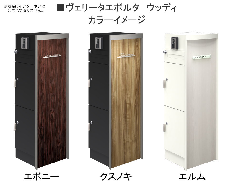 商 品 詳 細商品名【多機能ユニット ヴェリータエボルタ ウッディ】 NA1-VBW 機能門柱 一戸建て用 一体型サイズ(mm)本体:W450×H1400+埋め込み320×D436 ポスト投函口:W285×H40 点検蓋:W403×H258重量(kg)約47.0kgカラー[エボニー]化粧面:エボニー (本体:ブラック) [クスノキ]化粧面:クスノキ (本体:ブラック) [エルム]化粧面:エルム (本体:ブラック)材質[本体]亜鉛メッキ鋼板(仕上:防錆処理+焼付塗装) [額縁装飾部]ステンレス(仕上:焼付塗装) [点検蓋]亜鉛メッキ鋼板(仕上:防錆処理+焼付塗装) [前面パネル]ウッディ(仕上:屋外耐候性シート木調)仕様・ポスト部:ダイヤル錠付き ・ポスト投函口:W285×H40 ・宅配ボックス部:キーシリーンダー錠(錠は共通) ・宅配ボックス部の荷物を受け取りできるサイズ:W330×H450×D350 ・宅配ボックスは内部ロック解除機能付き ・表札付属(詳細は画像の各typeをご確認ください) ・表札灯付属(●AC100V(消費電力3.4W) LED照明 白色 ●1次側電源:現地にて結線) ※素材、サイズ、書体、色の変更不可。