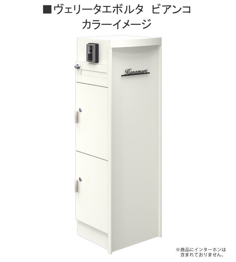 商 品 詳 細商品名【多機能ユニット ヴェリータエボルタ ビアンコ】 NA1-VBBWH 機能門柱 一戸建て用 一体型サイズ(mm)本体:W450×H1400+埋め込み320×D436 ポスト投函口:W285×H40 点検蓋:W403×H258重量(kg)約47.0kgカラー化粧面:ホワイト (本体:ホワイト)材質[本体]亜鉛メッキ鋼板(仕上:防錆処理+焼付塗装) [額縁装飾部]ステンレス(仕上:焼付塗装) [点検蓋]亜鉛メッキ鋼板(仕上:防錆処理+焼付塗装) [前面パネル]仕上:防錆処理+焼付塗装仕様・ポスト部:ダイヤル錠付き ・ポスト投函口:W285×H40 ・宅配ボックス部:キーシリーンダー錠(錠は共通) ・宅配ボックス部の荷物を受け取りできるサイズ:W330×H450×D350 ・宅配ボックスは内部ロック解除機能付き ・表札付属(詳細は画像の各typeをご確認ください) ・表札灯付属(●AC100V(消費電力3.4W) LED照明 白色 ●1次側電源:現地にて結線) ※素材、サイズ、書体、色の変更不可。